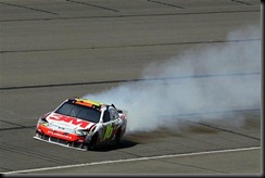 It was right after turn 4 that there was huge cloud that engulfed the #18 M&M’s Toyota Camry and everyone nearby. There was an instantaneous cheer coming from the grandstands. It seemed like we were right in the middle of Kyle Busch haters up in section 52.