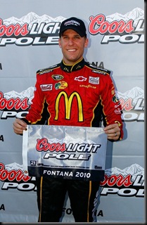 The number 1 McDonald’s Chevrolet driven by Daytona 500 and Brickyard 400 Champion Jamie McMurray leads the pack at the Auto Club Speedway capturing the pole for both races at the track in the 2010 season with a lap of 38.859 (185.285 mph.). You think that McDonald’s will be fueling the race tomorrow for the team with the power in the ECR engines? Also on the front row is the No. 19 Reynolds Ford driven by Elliott Sadler with a lap only -0.185 behind McMurray with a lap of 39.044 (184.407 mph.).