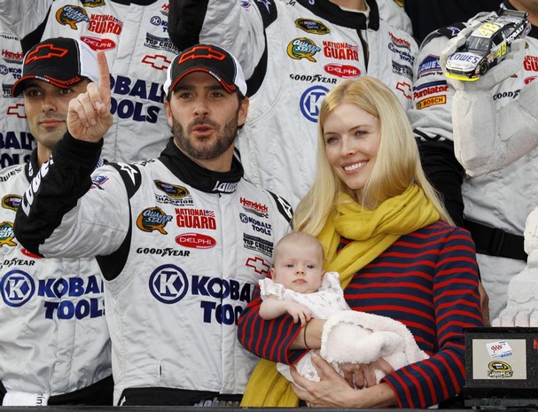 Jimmie Johnson celebrates with his daughter, Genevieve Marie,